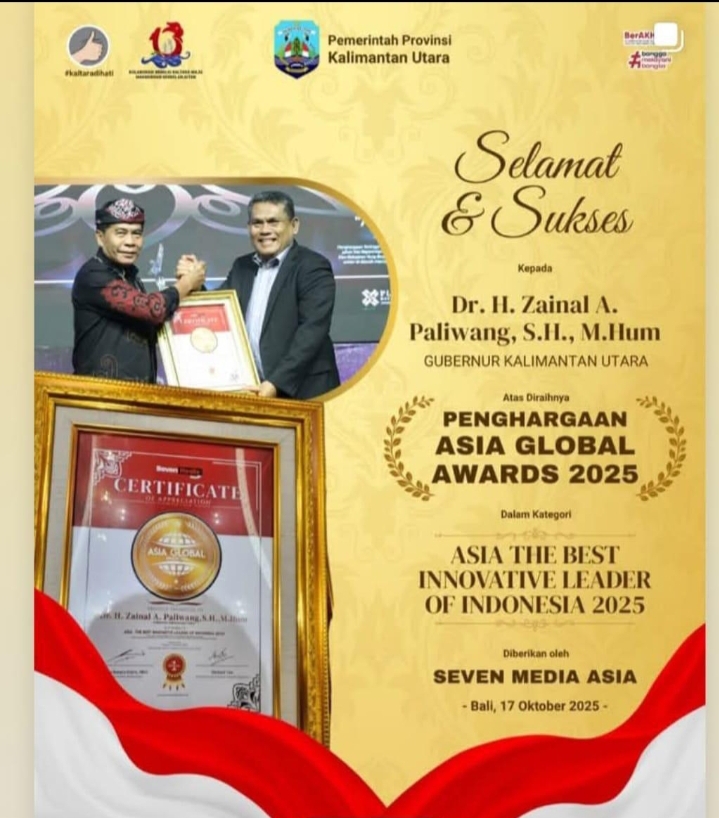 Bali.bentengkeadilannews.com. Prestasi gemilang yang membanggakan seluruh masyarakat Bumi Benuanta lagi-lagi ditorehkan oleh Gubernur Kalimantan Utara (Kaltara), Dr. H. Zainal Paliwang, SH, M.Hum yang kembali mendapatkan penghargaan dari Seven Media Asia dalam ajang spektakuler bertajuk “Asia Global Awards 2025” dalam kategori “Asia The Best Innovative Leader Of Indonesia 2025”. Penghargaan yang ketiga kalinya didapatkan (2023, 2024…