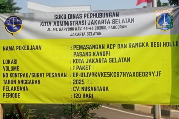 Jakarta.bentengkeadilannews.com. Pada bulan Oktober lalu awak media menemukan adanya pekerjaan proyek pemasangan ACP di gedung kantor Suku Dinas Perhubungan Jakarta Selatan, namun ada yang ganjal menurut pantauan wartawan bentengkeadilannews.com melihat banner atau papan proyek tersebut, sebab tidak lengkap atau tidak transparan, karena di banner proyek tidak disebutkan alamat perusahaan, nilai proyek, tanggal dan bulan berapa…