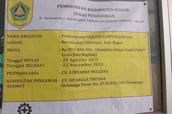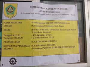 Bogor.bentengkeadilannews.com. Proyek vital renovasi ruang kelas belajar di Sekolah Dasar Negeri (SDN) Kp. Sawah 01 Cileungsi, Kabupaten Bogor, yang dikerjakan oleh CV STEVANNY MULIANA dengan nilai anggaran Rp 975.000.000 (sembilan ratus tujuh puluh lima juta rupiah) Konsultan Pengawas CV Upangga Triyasa, tanggal mulai kerja 25 Agustus 2025 dan berakhir tanggal 22 November 2025, disorot tajam…