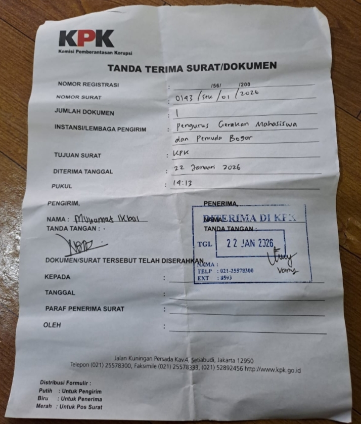 Bogor.bentengkeadilannews.com. Gerakan Mahasiswa dan Pemuda Bogor (GMPB) secara resmi melaporkan salah satu pejabat di lingkungan Pemerintah Kabupaten Bogor ke Komisi Pemberantasan Korupsi (KPK) atas dugaan keterlibatan dalam tindak pidana korupsi. Laporan tersebut merupakan bentuk komitmen GMPB dalam mengawal transparansi dan akuntabilitas pengelolaan keuangan negara, khususnya di wilayah Kabupaten Bogor.(22/01/26)