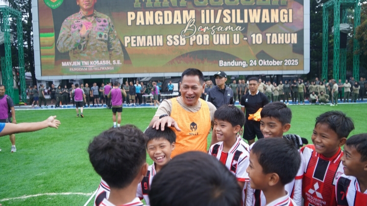 Bandung.bentengkeadilannews.com. Kodam III/Siliwangi menggelar pertandingan mini soccer persahabatan antara Pangdam III/Siliwangi Mayjen TNI Kosasih, S.E., bersama jajaran pejabat Kodam III/Siliwangi melawan tim SSB POR UNI U-10, di Lapangan Prajurit Kodam III/Siliwangi, Jalan Aceh No. 69, Kota Bandung, Jumat (24/10/2025).
