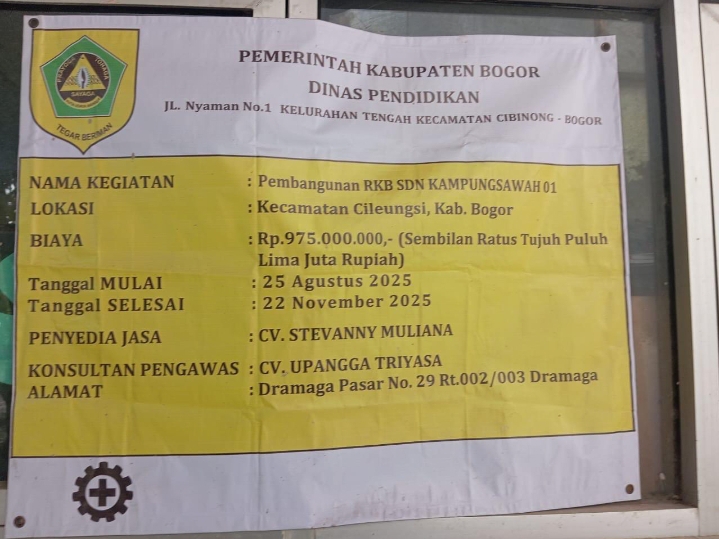 Bogor.bentengkeadilannews.com. Proyek vital renovasi ruang kelas belajar di Sekolah Dasar Negeri (SDN) Kp. Sawah 01 Cileungsi, Kabupaten Bogor, yang dikerjakan oleh CV STEVANNY MULIANA dengan nilai anggaran Rp 975.000.000 (sembilan ratus tujuh puluh lima juta rupiah) Konsultan Pengawas CV Upangga Triyasa, tanggal mulai kerja 25 Agustus 2025 dan berakhir tanggal 22 November 2025, disorot tajam lantaran telah melewati batas waktu penyelesaian yang ditentukan dalam kontrak. Keterlambatan ini tidak hanya mengganggu proses belajar mengajar, tetapi juga memicu kekecewaan publik.