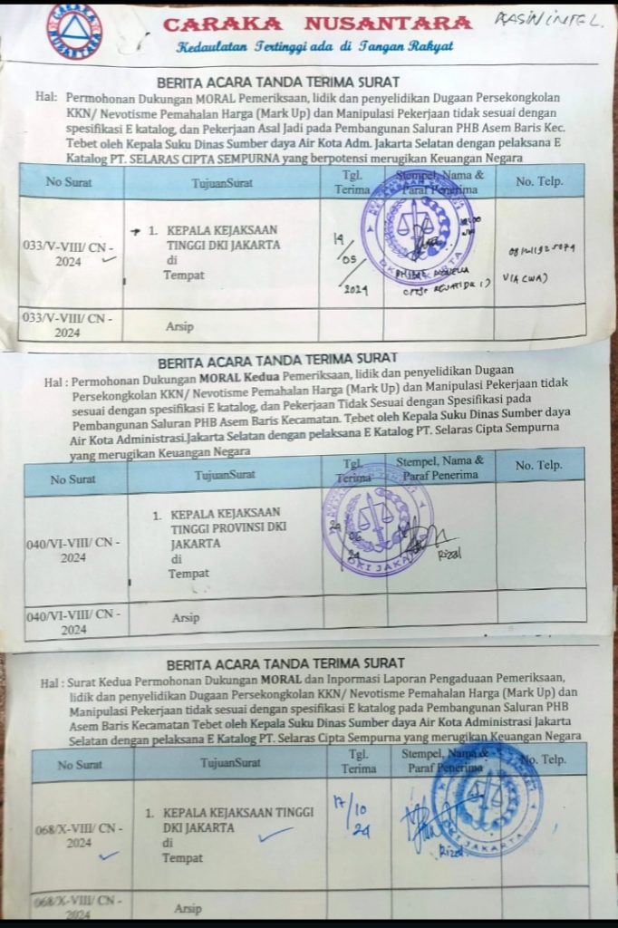 Jakarta.Bentengkeadilannews.com. LSM Caraka Nusantara sudah tiga kali berkirim surat mengenai Permohonan Dukungan MORAL dan Informasi Laporan Pengaduaan Pemeriksaan, lidik dan penyelidikan Dugaan Persekongkolan KKN/ Nevotisme Pemahalan Harga (Mark Up) dan Manipulasi Pekerjaan yang tidak sesuai dengan spesifikasi E katalog pada Pembangunan Saluran PHB Asem Baris Kecamatan Tebet oleh Kepala Suku Dinas Sumber daya Air Kota Administrasi Jakarta Selatan dengan pelaksana E Katalog PT. Selaras Cipta Sempurna dan PT. Mega Kreasi Bersinar yang diduga merugikan Keuangan Negara sudah satu tahun lebih tidak berjalan di Kajati DKI maupun di Kajari Jakarta selatan sampai akhir tahun 2025 yang tidak mendapat kejelasan sedikit pun.