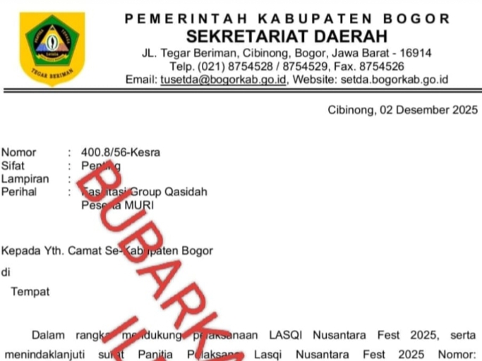 Setda Kabupaten Bogor Diduga Bungkam Terkait Surat Edaran Perihal : Fasilitas Group Qasidah MURI