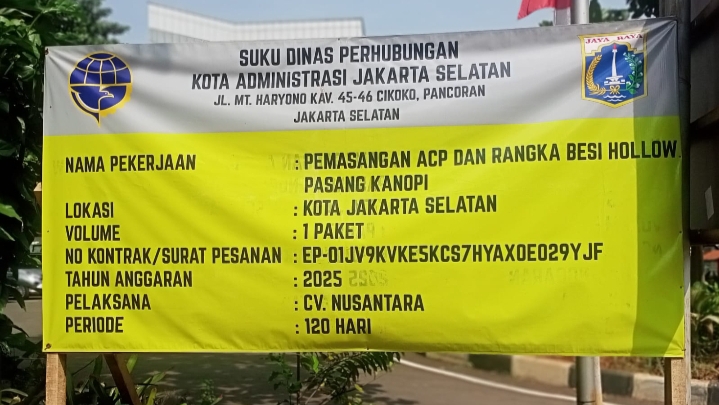 Supaya masyarakat dan siapapun bisa mengawasi atau ikut memantau proyek tersebut? Contoh di banner disebutkan THN anggaran 2025,dan priode 120 hari kerja,emang masyarakat tahu itu mulainya kapan, siapa tahu mulai dari awal tahun? Jadi proyek tersebut diduga ada praktek KKN, untuk itu diminta kepada Kepala Dinas Perhubungan agar segera melakukan pemeriksaan terhadap proyek dan pihak Suku Dinas Perhubungan Jakarta Selatan dan bila perlu juga Gubernur DKI bersama aparat penegak hukum untuk ikut turun tangan dalam hal ini, karena ini proyek kemungkinan bukan pekerjaan Penunjukan Langsung (PL) yang anggaran 100-200 JT, bisa jadi anggaran diatas 1 millyaran, supaya mencegah tidak adanya kerugian uang negara dalam hal ini keuangan daerah.